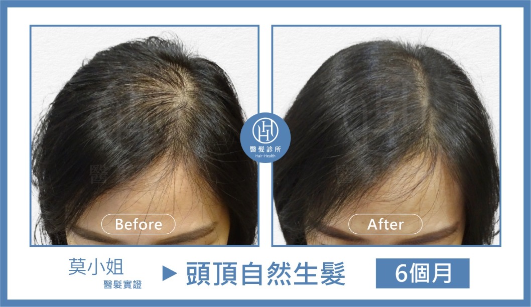 生完小孩後掉髮變得非常嚴重,尤其是頭頂分線的位置越來越寬,讓我每次照鏡子都很焦慮。原本想靠洗髮精或營養品改善,但嘗試幾個月下來,效果並不明顯。來到HH醫髮診所諮詢後,醫師建議施作生髮療程,幫助活化毛囊並改善頭皮環境。持續6個月後,新生髮逐漸長出,分線也不再那麼明顯,髮量恢復得很自然! -
